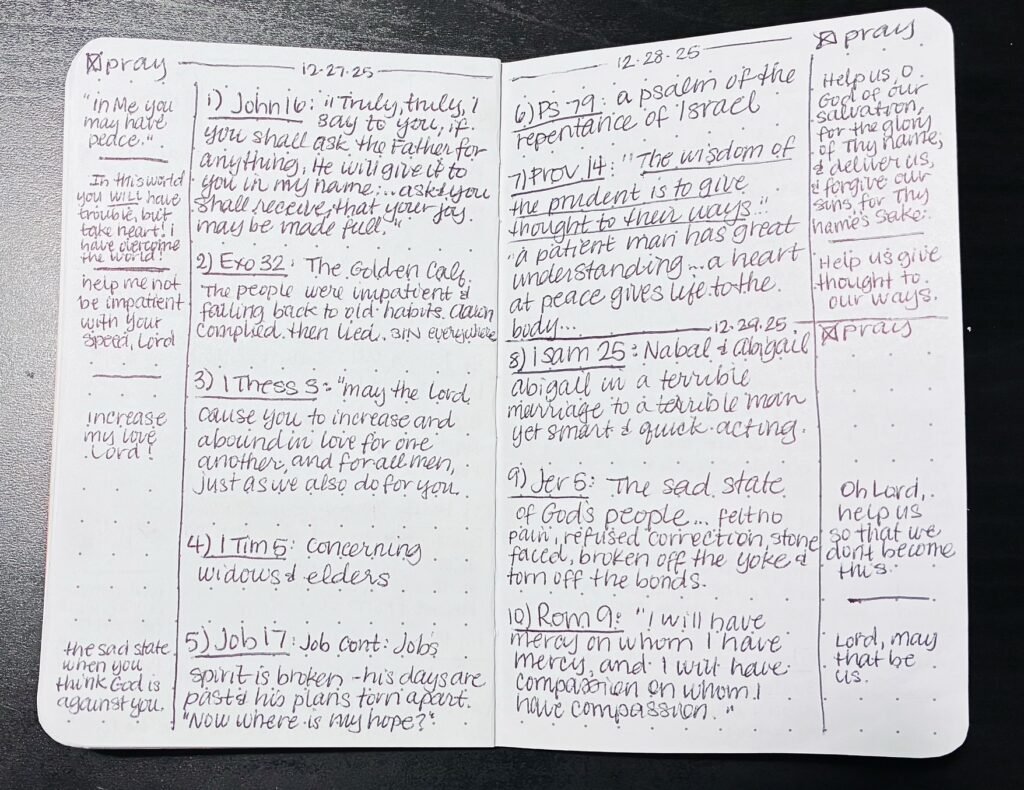 The perpetual Bible reading plan is still going very well. I will keep that up all year. After I fill each notebook I’ll check in with you guys here and share what stood out.