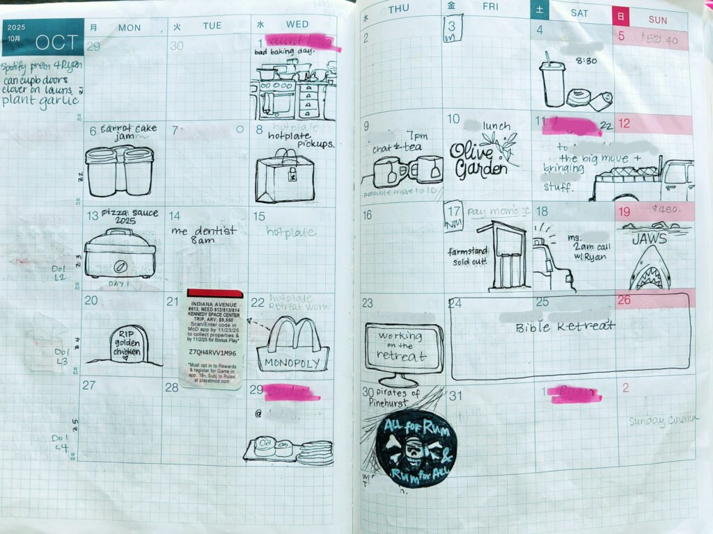 For years I used the bullet journal, but a couple years ago I needed something that required way less set up than a bullet journal. After trying a few options, I’ve comfortably settled on the Hobonichi Cousin. It is a more expensive planner, but it has monthly calendars (that I use for appointments and plans, and I try to add a doodle for the day in each square at the end of the day)