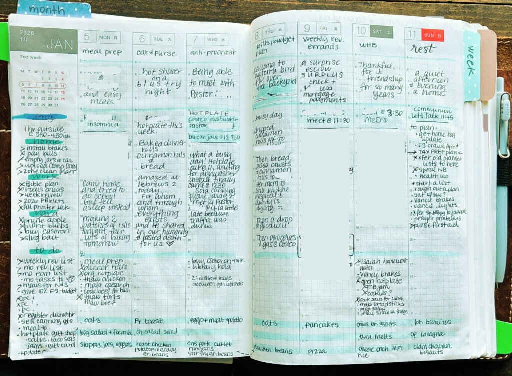 I am praying that 2026 is a year that I can focus on being fruitful. A focus on fruitfulness feels different than focusing on being productive. Fruitfulness helps get the focus off of me and what I accomplished (or didn’t) and focus more on God and what He had for me that day. So I’m trying to go into 2026 with a mindset of fruitfulness and holding on to my to-do lists loosely. However, that doesn’t mean just throwing everything to the wind and having a “let go and let God” mindset. I am called to redeem the time, to be diligent, faithful, and fruitful, and called “to doing what is good in order that they may provide for daily necessitits and not live unproductive lives.” -Titus 3:14 So in order to accomplish that, I’ve set up some tools that I know help me. Here’s what I’ve got going so far: