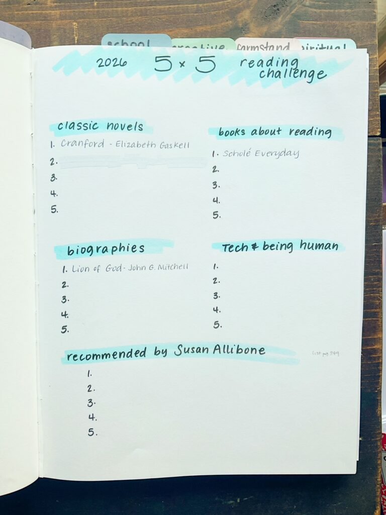 I divided it up into 5 main sections: Books, School, Creative, Farmstand, and Spiritual/Journal. I’ll be using it for my 5×5 reading challenge to keep track of the books I’m going to read and to take notes behind this page. (I’ll post more on this challenge later!)