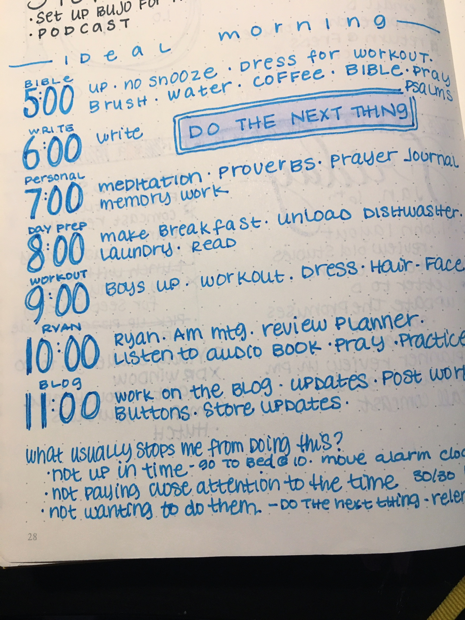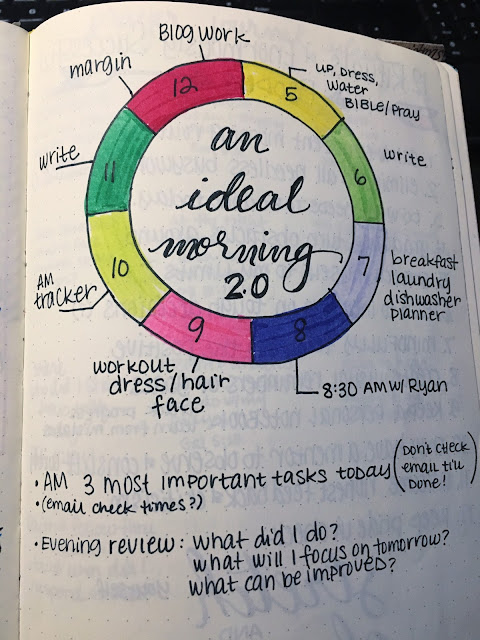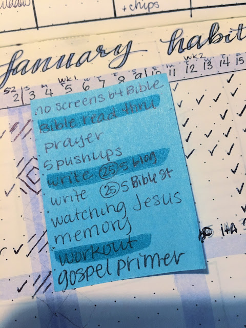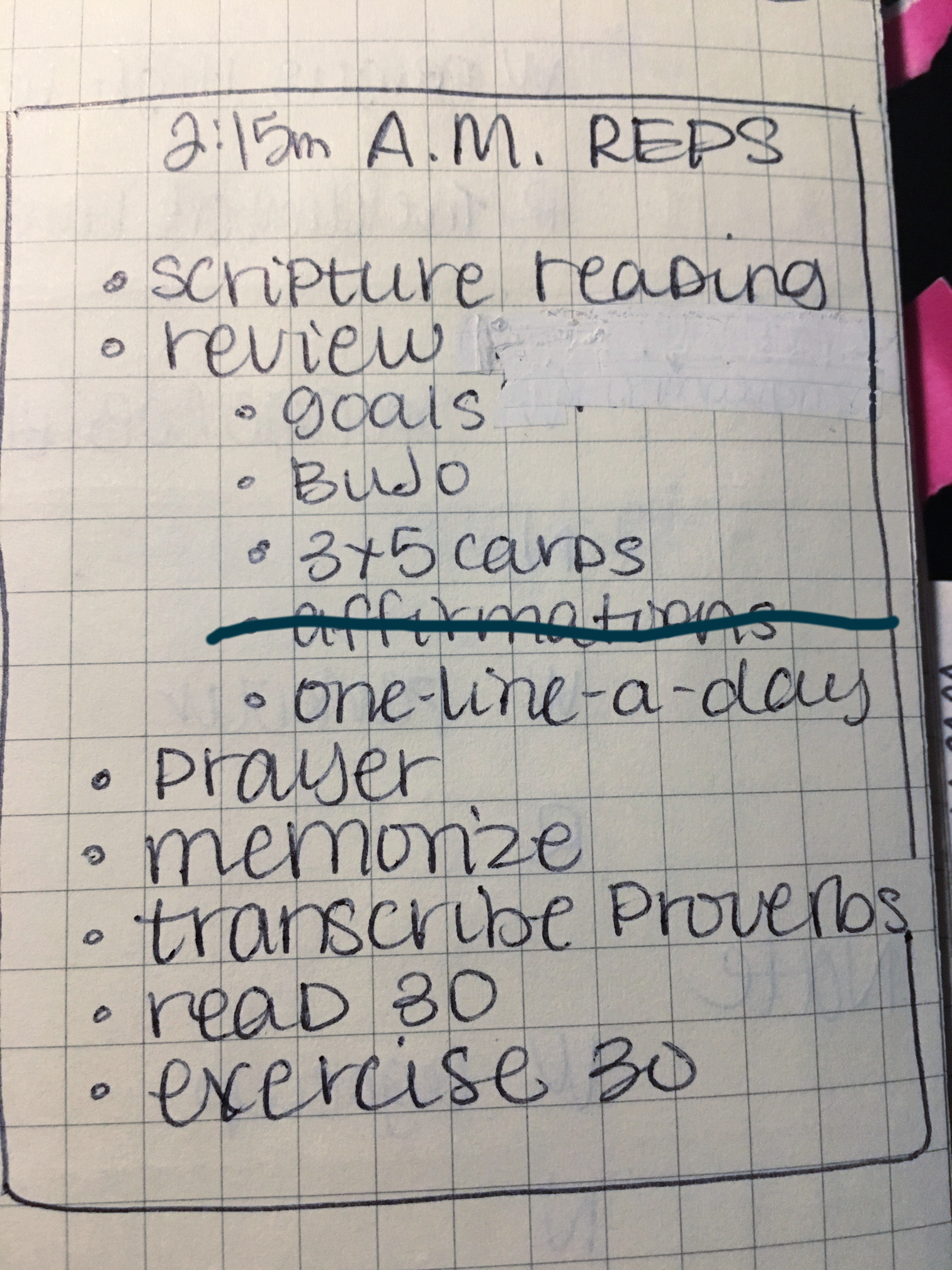 This was a simple morning routine from 2014. (I tried “affirmations” in the morning because of some book I was reading at the time and it just felt weird and kinda stupid. I am who Christ says I am, not who I say I am. So I crossed that one out never to return to again.)