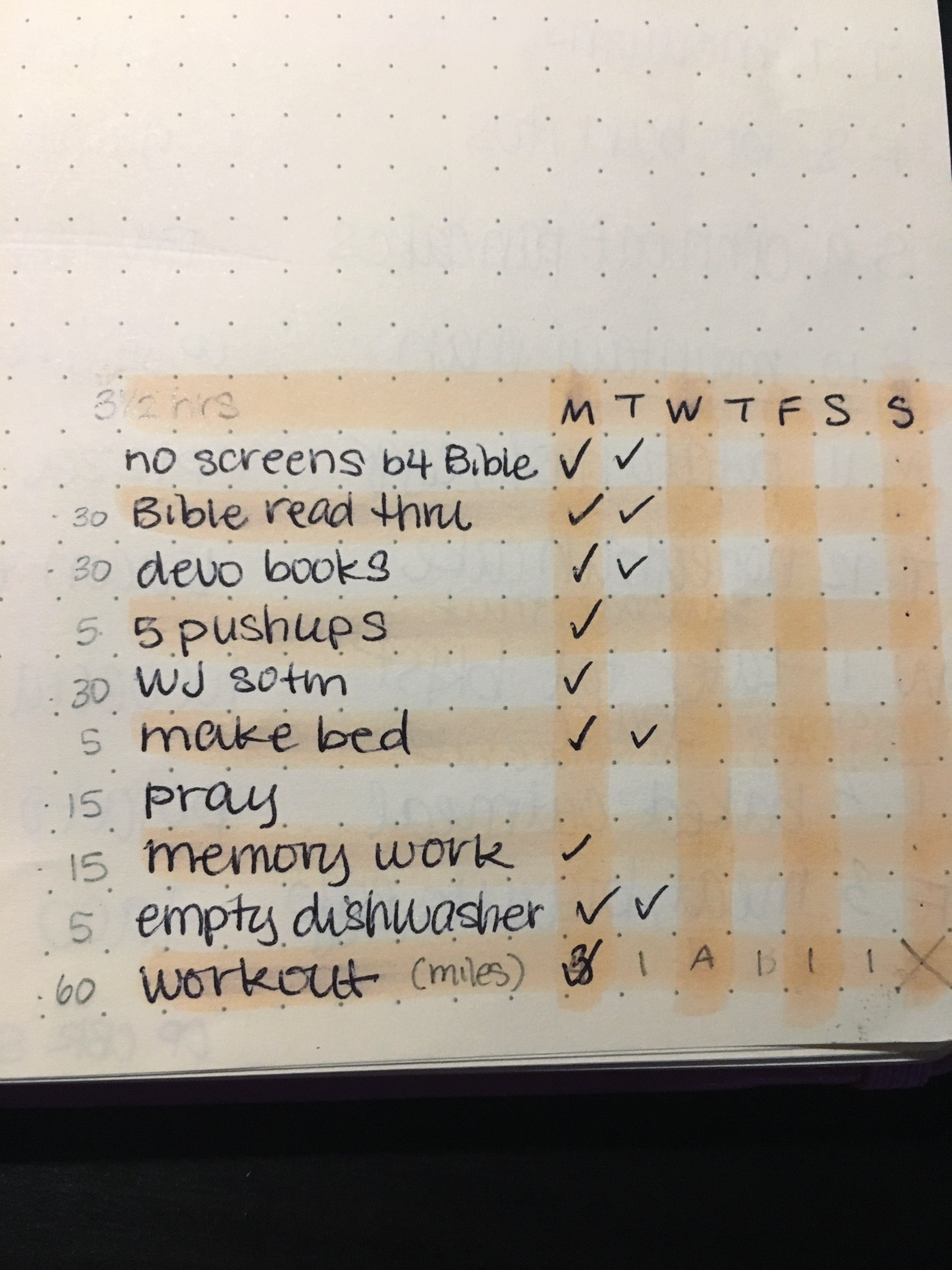 But of course, I’m always changing some things. I don’t have to write down to make bed or empty dishwasher anymore as they are habits now. I make my bed before I leave the room for the day and I empty the dishwasher as my coffee is brewing. (It takes about 3 minutes, even on the really full dishwasher days. Who knew?)The highlighted habits are the top three. If I have a busy day or don’t feel well, if I at least get those three done, I’ll count it a success. It’s based on the fact that I know those are the three I am most likely to put off and are the hardest for me to discipline myself to do. The others are a bit easier and require less willpower to complete.