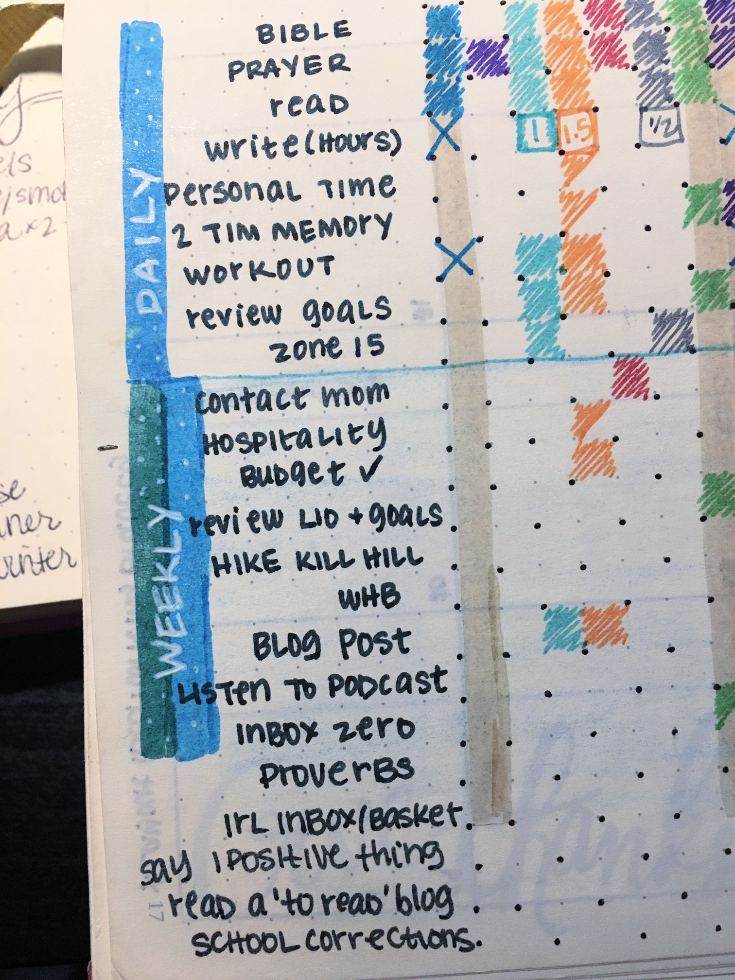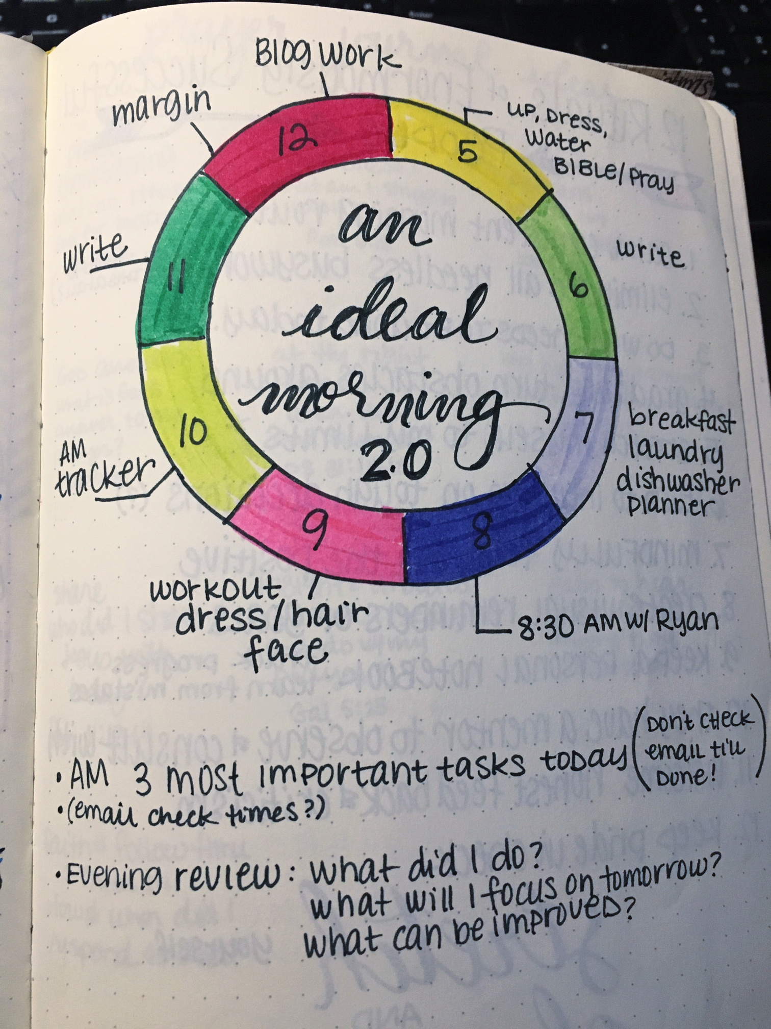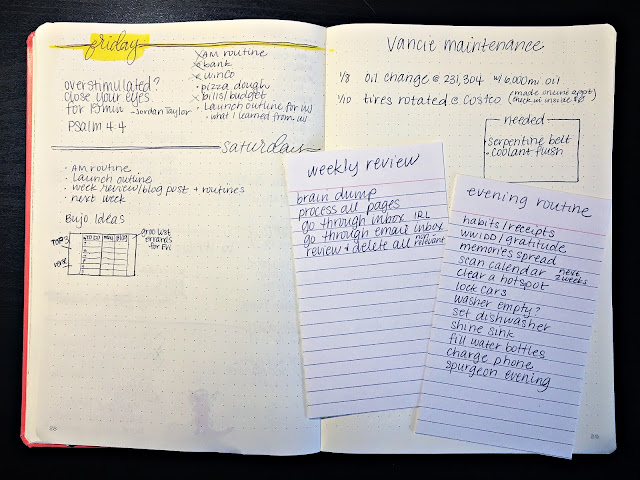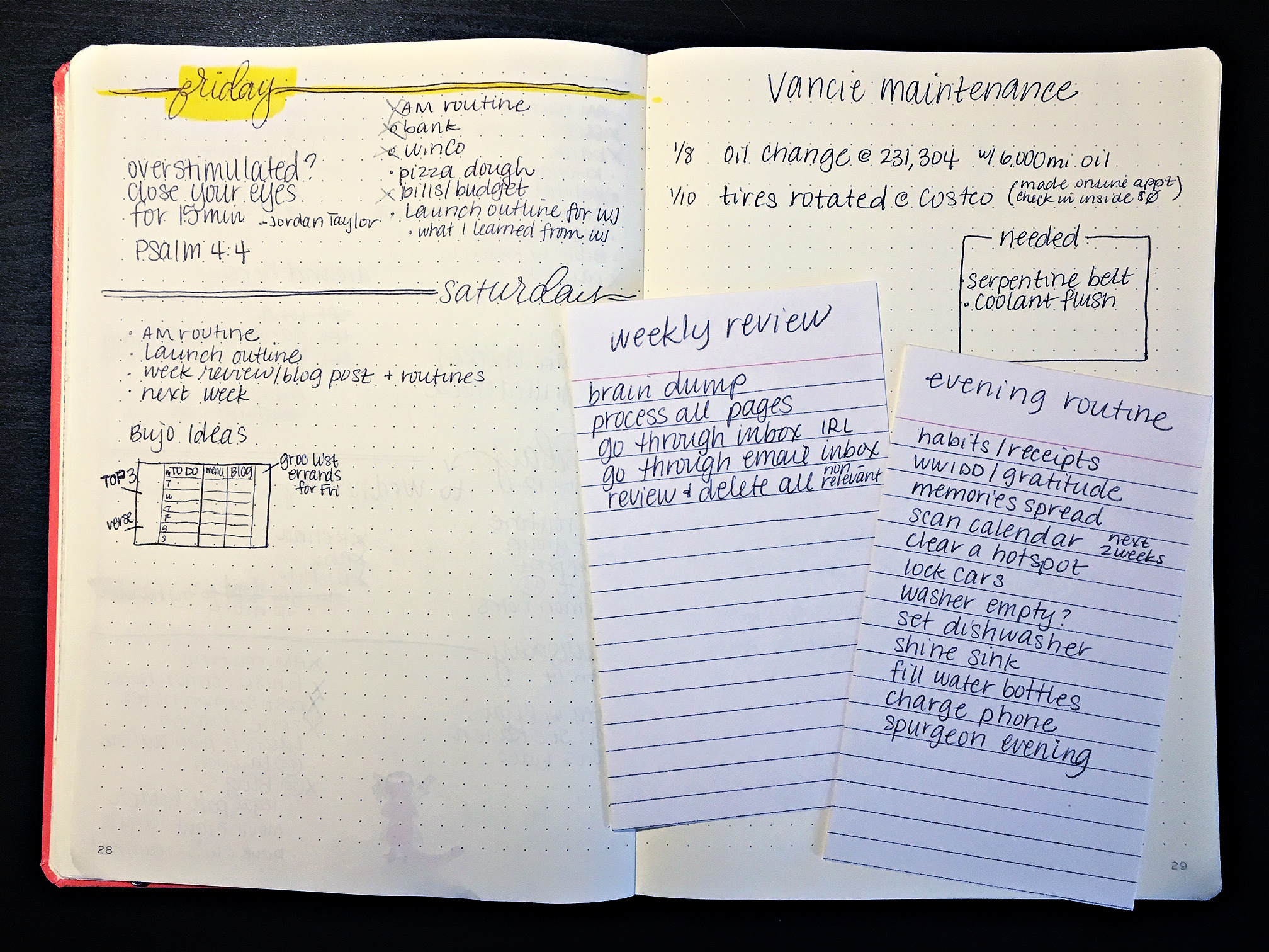 For this week, I’m going to try a new weekly layout I found in one of my old bullet journals. It’s doodled there on the left page. I thought I’d also share what I’m hoping to do for my weekly review and evening routines for the next few weeks.