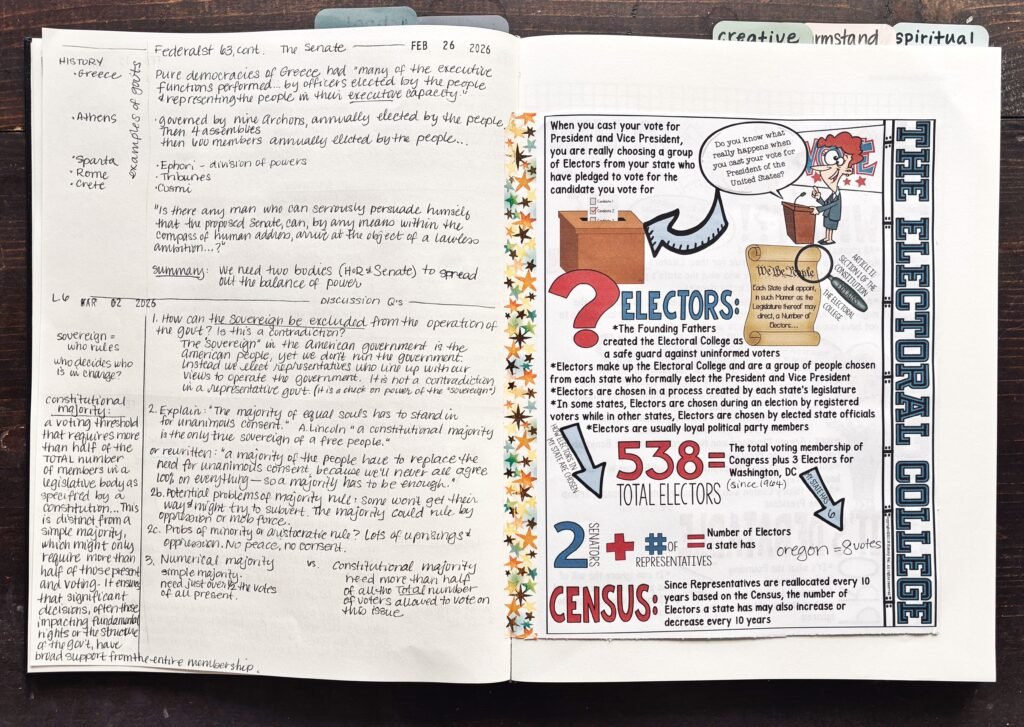 I’m using my 2026 notebook to take notes, add thoughts, and answer questions. (It’s a commonplace/thinking/learning kind of journal of my year and I’m loving it. It is so much simpler than finding a specific notebook to record a specific thought or item!) I’ve been reading the assigned selections and annotating the book. (I bought a physical copy, because I have hopes to continue on to the Constitution 101 course eventually. And I have a really hard time reading complicated subjects like this online.), then adding notes to my notebook.