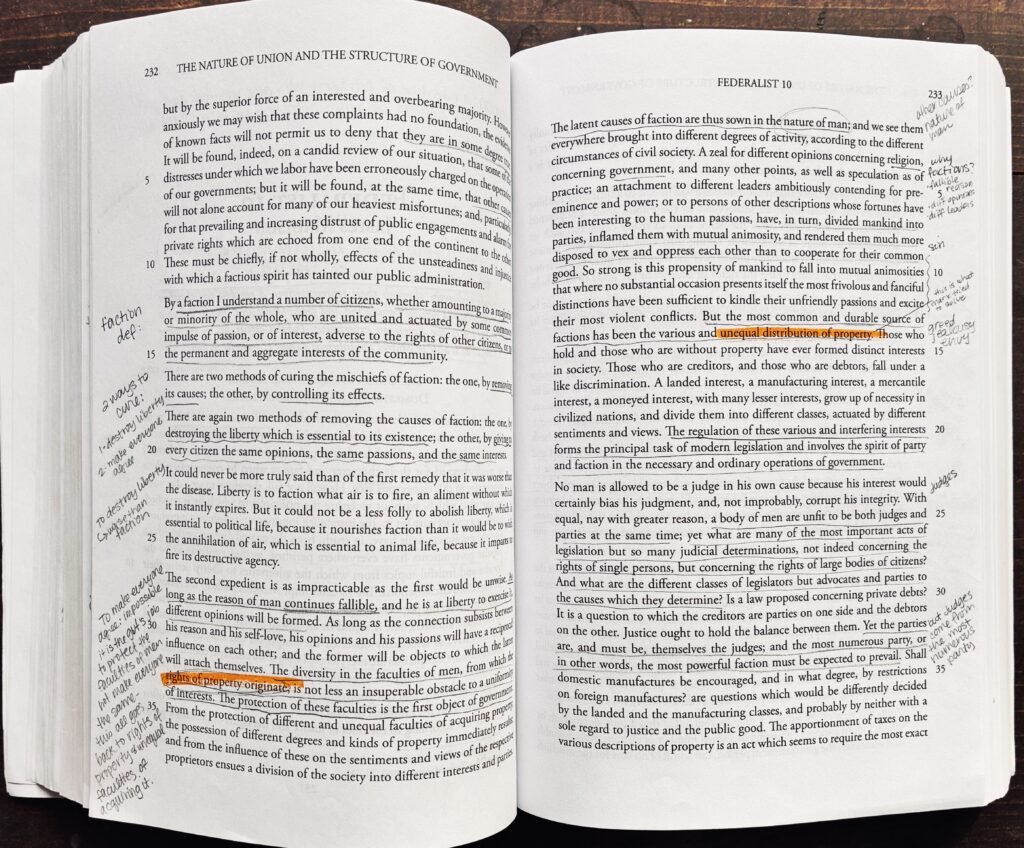 Sometimes I’ll print out stuff online that helps me further my understanding. It was interesting that in the Federalist 10, James Madison said some of the sources of factions include “a rage for paper money, an abolition of debts, and an equal division of property.” (And here we are 230 years after this was written, with paper money, and people calling for the abolition of debts, and an equal division of property.)