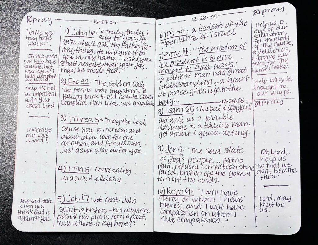 This has been an incredible way to read the Bible, and switching the system up to a different translation has been a nice change. I love this plan so much and will be sticking with it for years! After I fill this notebook (in about two weeks), I’ll spend a couple days flipping through it and noting what stood out and see if there are any themes. It was so fun to do that with my previous one!
