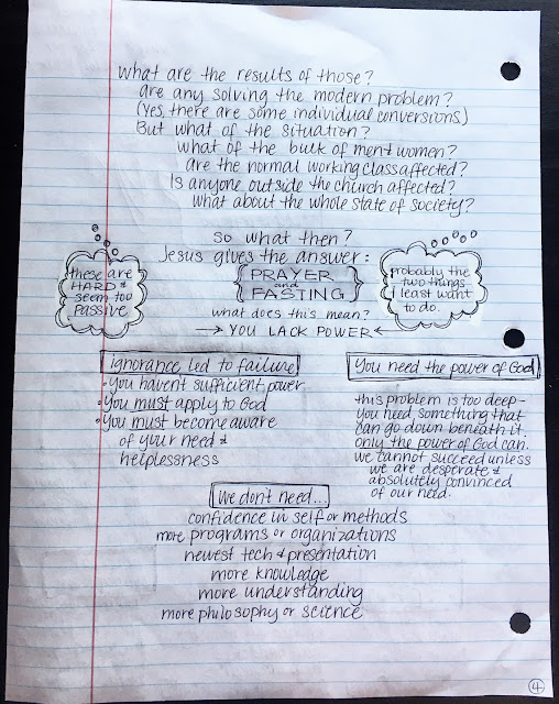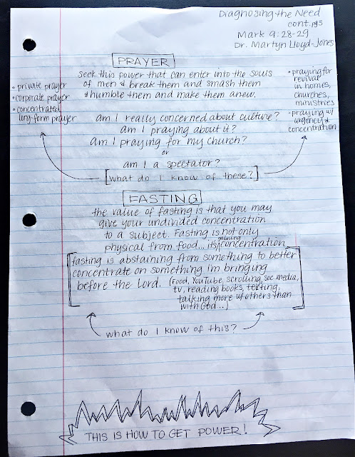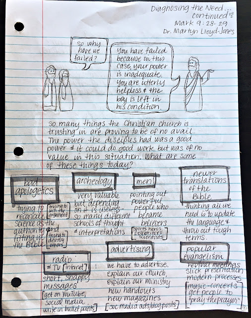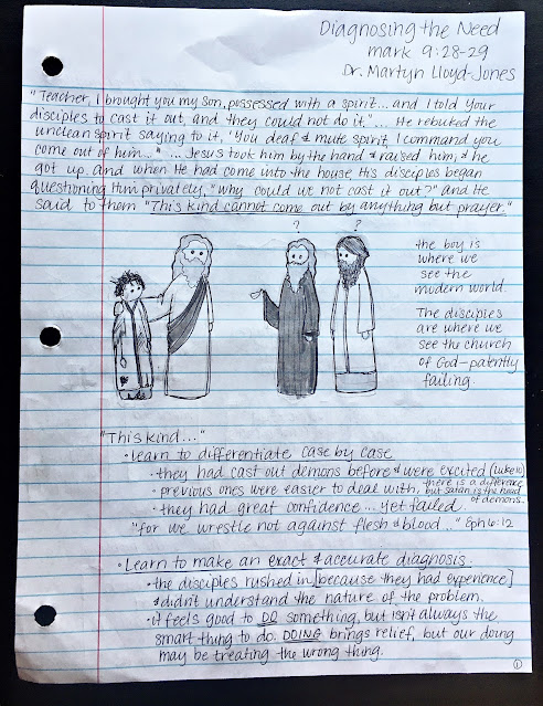 Some friends and I are currently going through his massive book Studies in the Sermon on the Mount (a book that our pastor and Pastor John MacArthur and many others said completely changed their lives, and boy is it making a difference in ours!). Sometimes I’ll pull up a sermon on the app, and take notes and then summarize and doodle. There’s something about thinking though how to organize notes and what to illustrate (and how) that makes it stick in my head. So, here are my notes from the sermon on Mark 9:29-29, Diagnosing the Need.