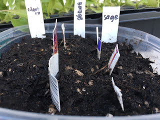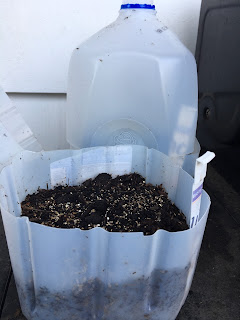 This is a new experiment of putting a mass of seeds into potting soil (or compost) in a milk jug. I spread a bunch of seeds evenly on the surface, watered in well, and will wait for them to sprout then will prick them out to separate modules.